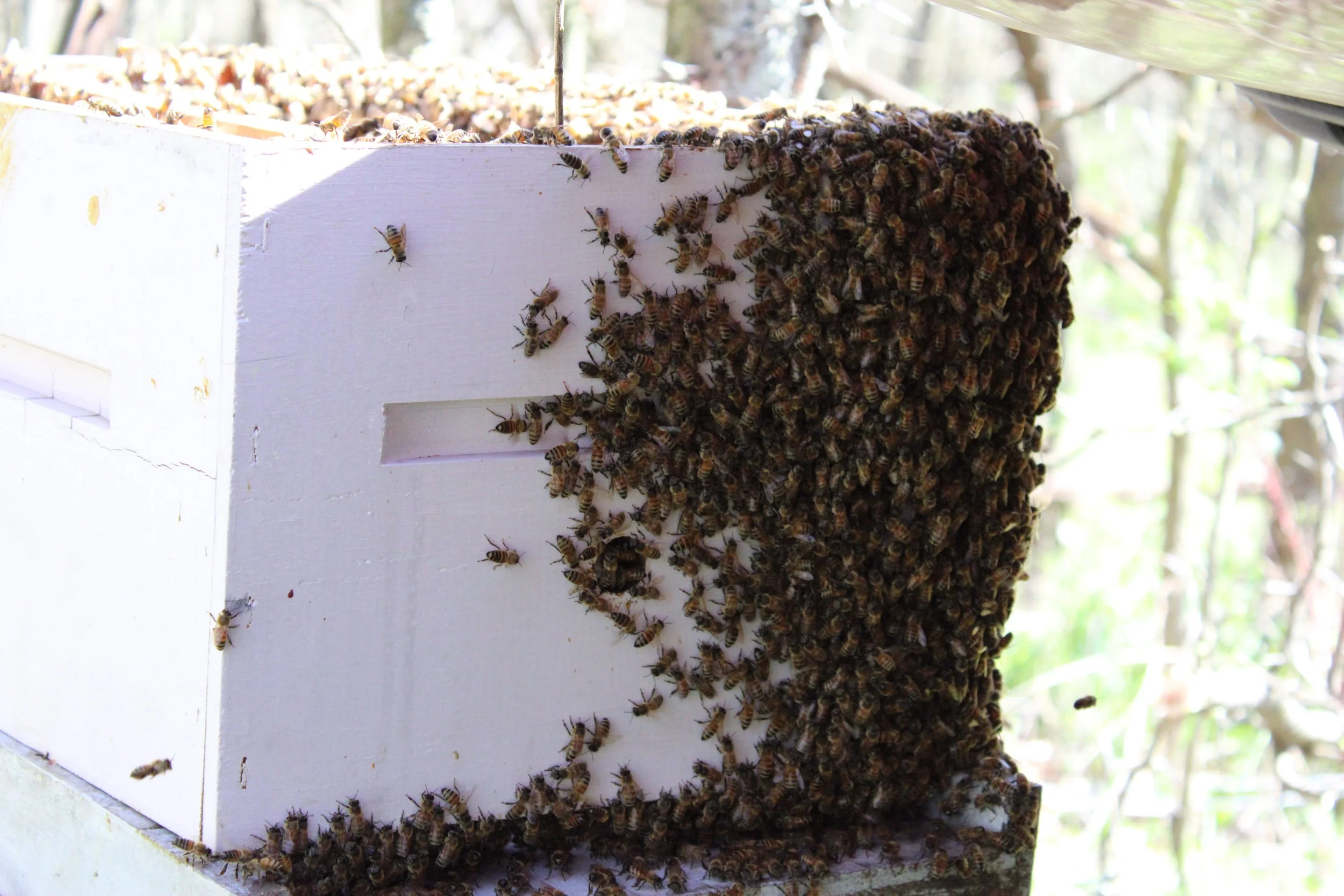 Swarms are hives in need of a home. A swarm (photo below) often is out of place and fairly easy to spot. The bees are in search of a new palace. Most commonly, a hive has grow over the cooler months and have created another queen. The queen has to fight for the crown. The winning queen takes over or resumes her duties. The departing queen takes the Ladies in Waiting and in a hurry and now without a home. While the swarm is protecting the queen, scout bees are looking for a new place to live. Swarms may stick around a day to two but will move on. Beekeepers provide a new palace with walls already in place so they can begin to build their queendome.